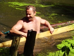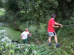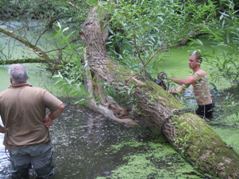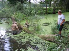 Im Winter stürzte ein großer Baum in den hinteren Abschnitt des Teiches. Zuerst wollten wir ihn als Unterstand für die Fische drinnen lassen, aber bald stellte sich heraus, dass die Strömung des Wassers behindert wurde und sich dadurch Wasserlinsen stark vermehrten und ausbreiteten. Um die Wasserlinsen entfernen zu können, mussten zuerst der Baum raus. Trotz Traktor mit schwerer Seilwinde war das nicht so einfach.