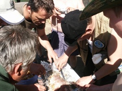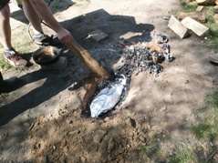 Ein Loch wird gegraben, der Karpfen ordentlich gewürzt und dann mit Glut bedeckt.