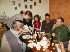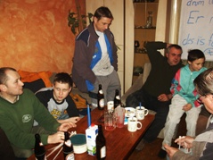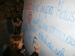 Das zweite Transparent musste anschließend nach Ried gebracht werden. Da wir keinen geeigneten Platz zum Aufstellen oder Aufhängen fanden, wurde es kurzerhand in der Wohnung entrollt und aufgehängt. Obwohl Roland schon bei Peperls Spanferkel im vergangenen Sommer mitgezahlt hatte, lud er uns trotzdem noch zu Jause und Getränken ein.