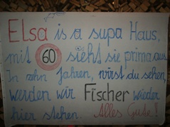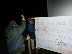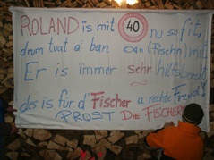Am 4. Jänner 2007 gab es ein besonderes Ereignis. Zwei Mitglieder unserer Fischerrunde feierten zusammen einen 100er. Das Einmalige dabei ist, dass es sich dabei um Mutter und Sohn handelt, die am gleichen Tag, noch dazu einen runden Geburtstag hatten. Elsa Frauscher wurde 60 und Roland Frauscher 40! Also mussten wir dieses Mal am Vortag gleich zwei Transparente anfertigen und aufstellen.