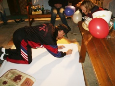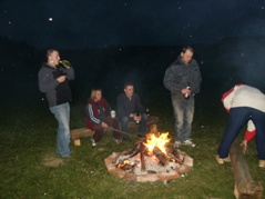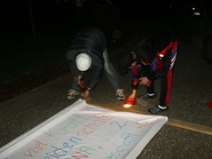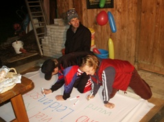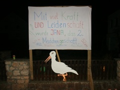 Am 13.4. war es mit einiger Verspätung so weit: Als zweites Töchterchen von Elisabeth und Roland Aigner erblickte Jana das Licht der Welt. Am Abend wurde unter den Mitgliedern der Fischerrunde ein Rundruf gestartet, da wir natürlich wieder ein Transparent anfertigen und aufzustellen wollten. Wir trafen uns bei unserem Mitglied Manfred Gaisbauer, der etwas überrascht war, weil er darüber nicht informiert wurde. Nach einiger Verzögerung - wir wärmten uns vorher am Lagerfeuer - klappte es doch wieder mit dem Anfertigen und Aufstellen des Transparentes und des Storches.