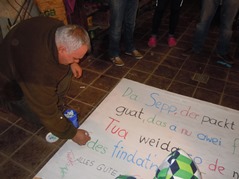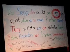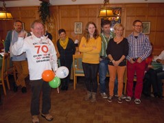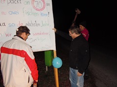 Unser ältestes Mitglied, Josef Grüll, der auch im Vorstand als Beisitzer vertreten ist, feierte am 2. März seinen 70sten Geburtstag. Also trafen wir uns am Samstag vor dem Stammtisch um ein Transparent anzufertigen und aufzustellen. Obwohl diesmal sehr viele Mitglieder anwesend waren, oder gerade deshalb dauerte alles ziemlich lange und wir schafften es gerade noch rechtzeitig zum Stammtisch.