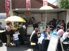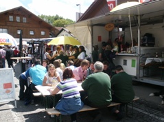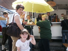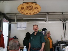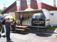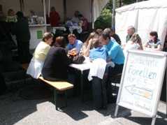 Da das Aufstellen des Zeltes samt Boden sehr zeitaufwändig ist, versuchten wir es diesmal mit einem Ausschankwagen, den wir uns in Kirchheim ausliehen. Da das Wetter annehmbar war, klappte das mit dem Wagen sehr gut. Der Verkauf lief am Nachmittag ganz gut und die Räucherforellen waren wie immer bald ausverkauft.